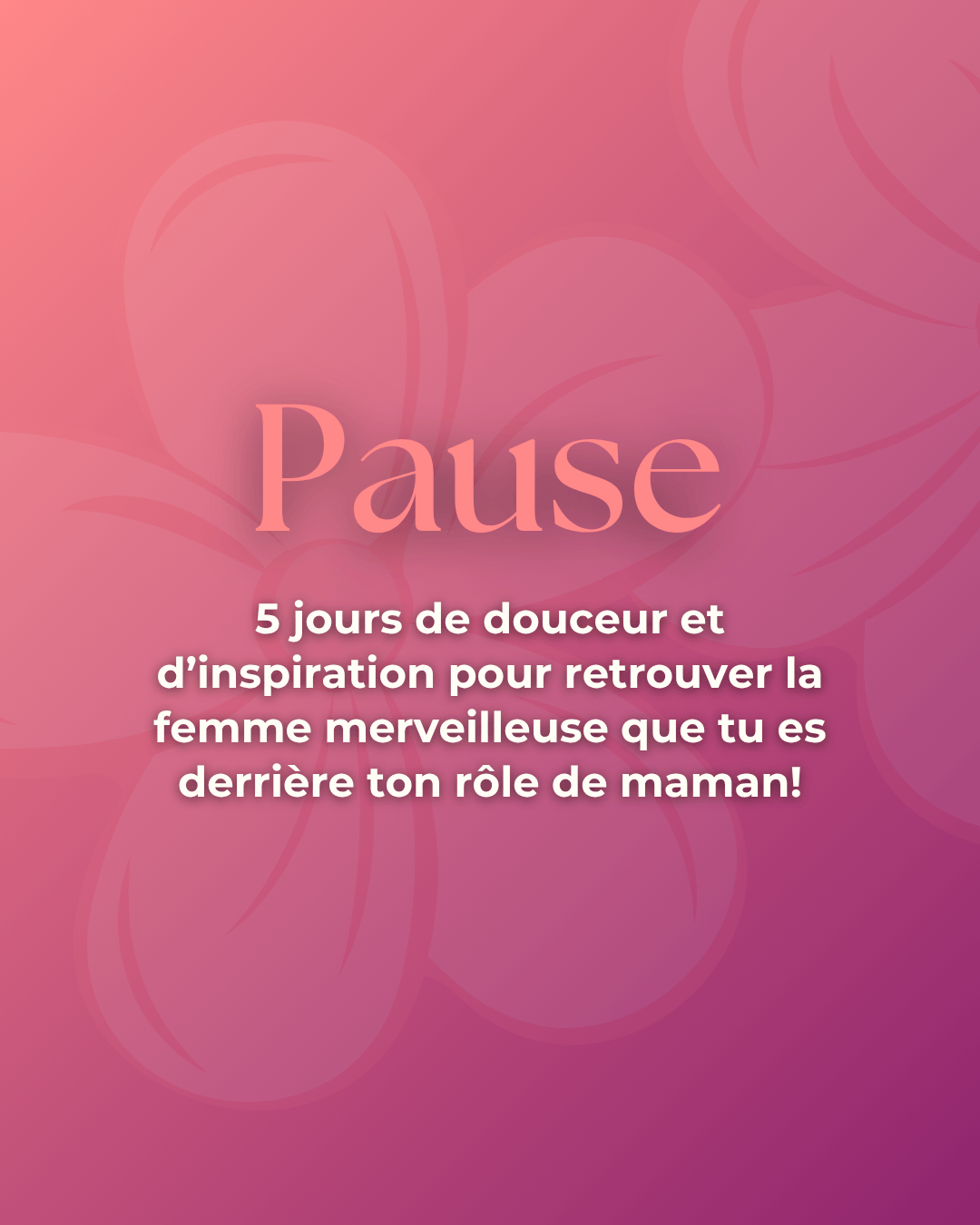 PAUSE est un événement en ligne de 5 jours, conçu pour les mamans qui désirent retrouver leur énergie, leur confiance et leur calme intérieure.